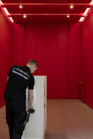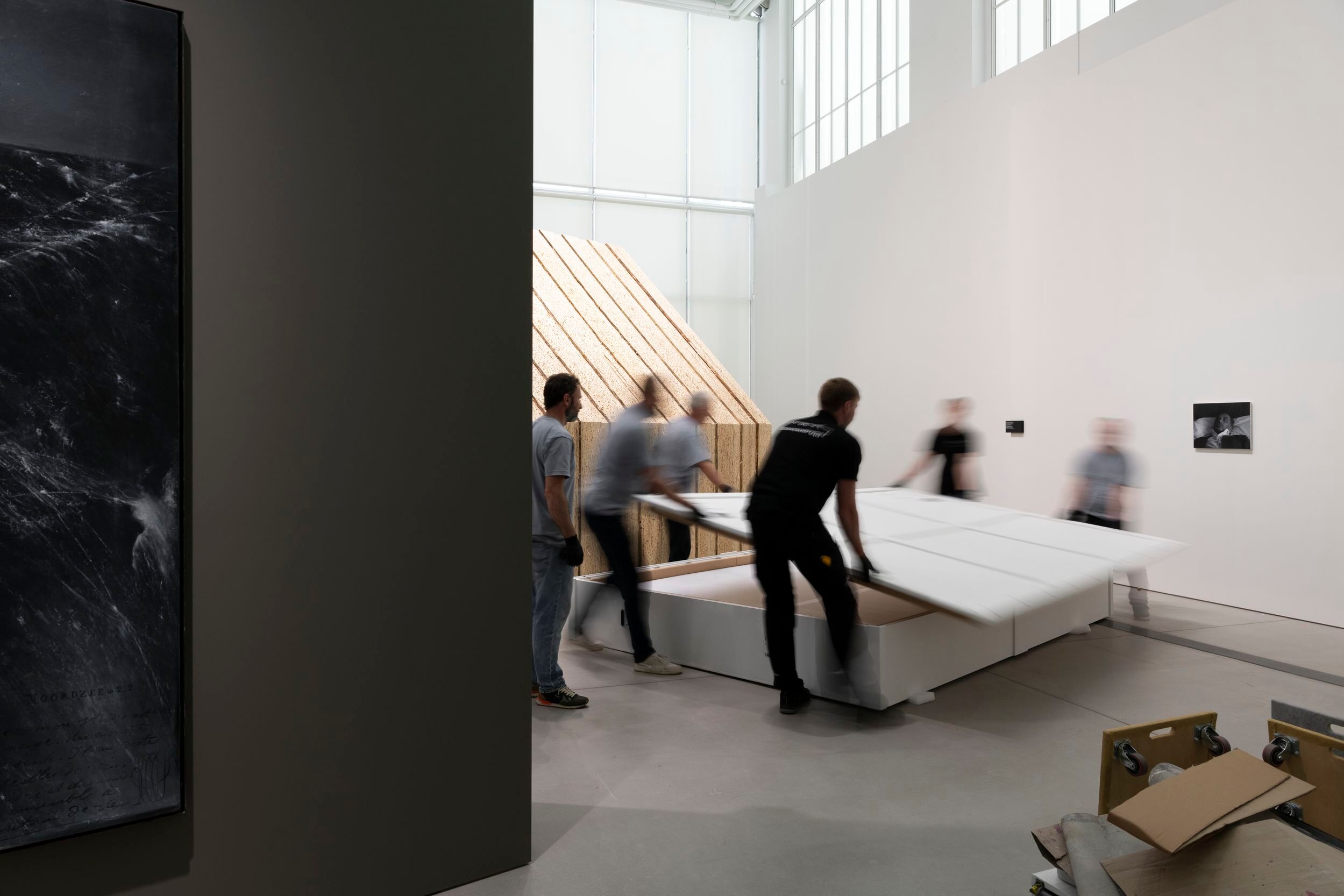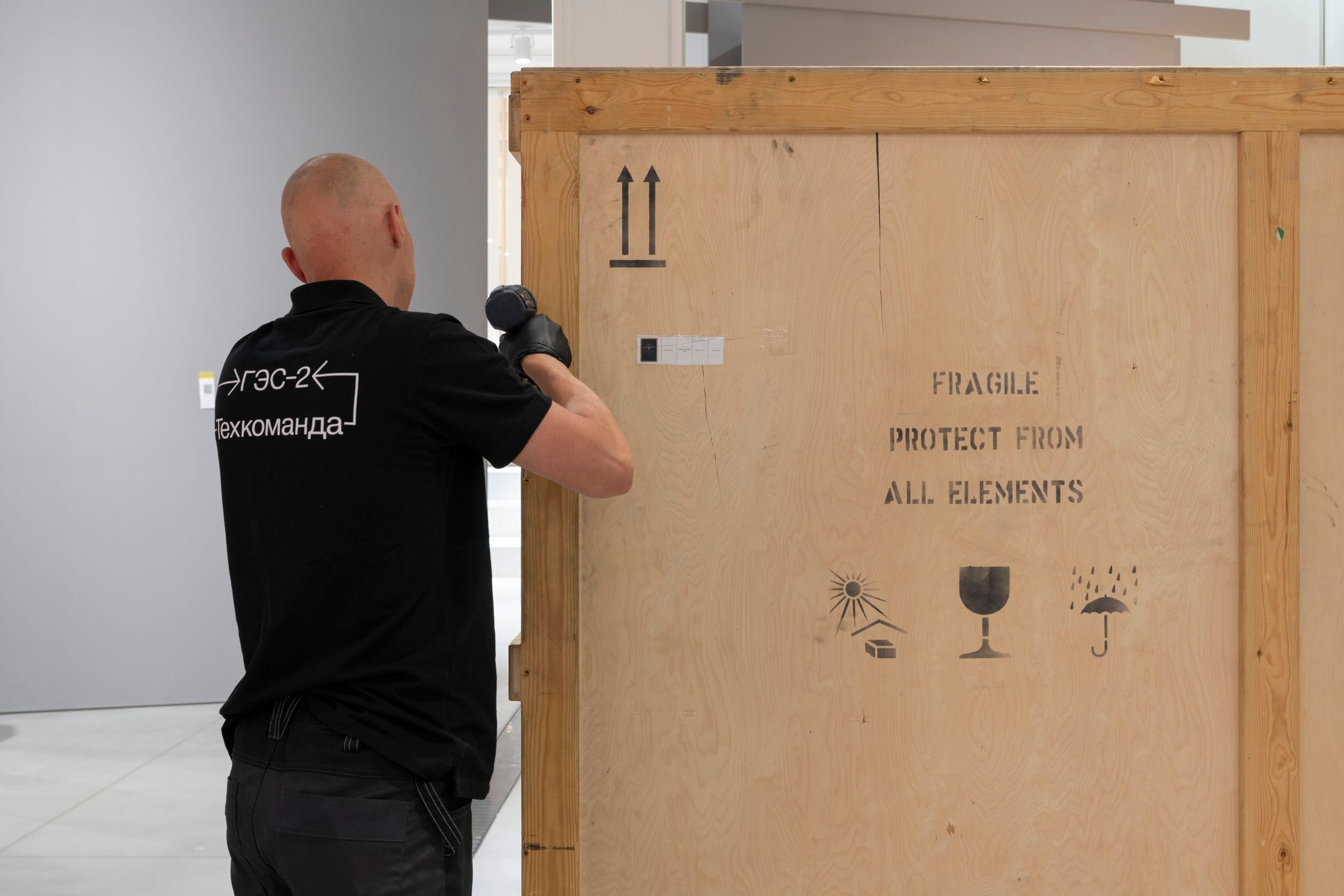 В первую очередь с хранителем, который постоянно присутствует при работе с произведениями искусства. Без хранителя мы даже не открываем ящик с предметом. Каждый этап процесса фотографируется: открыли крышку, сняли верхний слой упаковки, достали работу и так далее. Мы вместе обсуждаем все решения, связанные с упаковкой, подготовкой к транспортировке, монтажом. Поэтому так важно взаимопонимание между хранителем и арт-хендлером. Еще мы тесно работаем с продюсерами, техническими специалистами, а также кураторами: их присутствие на выставочной площадке во время монтажа тоже обязательно, поскольку именно они, иногда вместе с авторами, принимают решение о расположении объектов в экспозиционном пространстве.