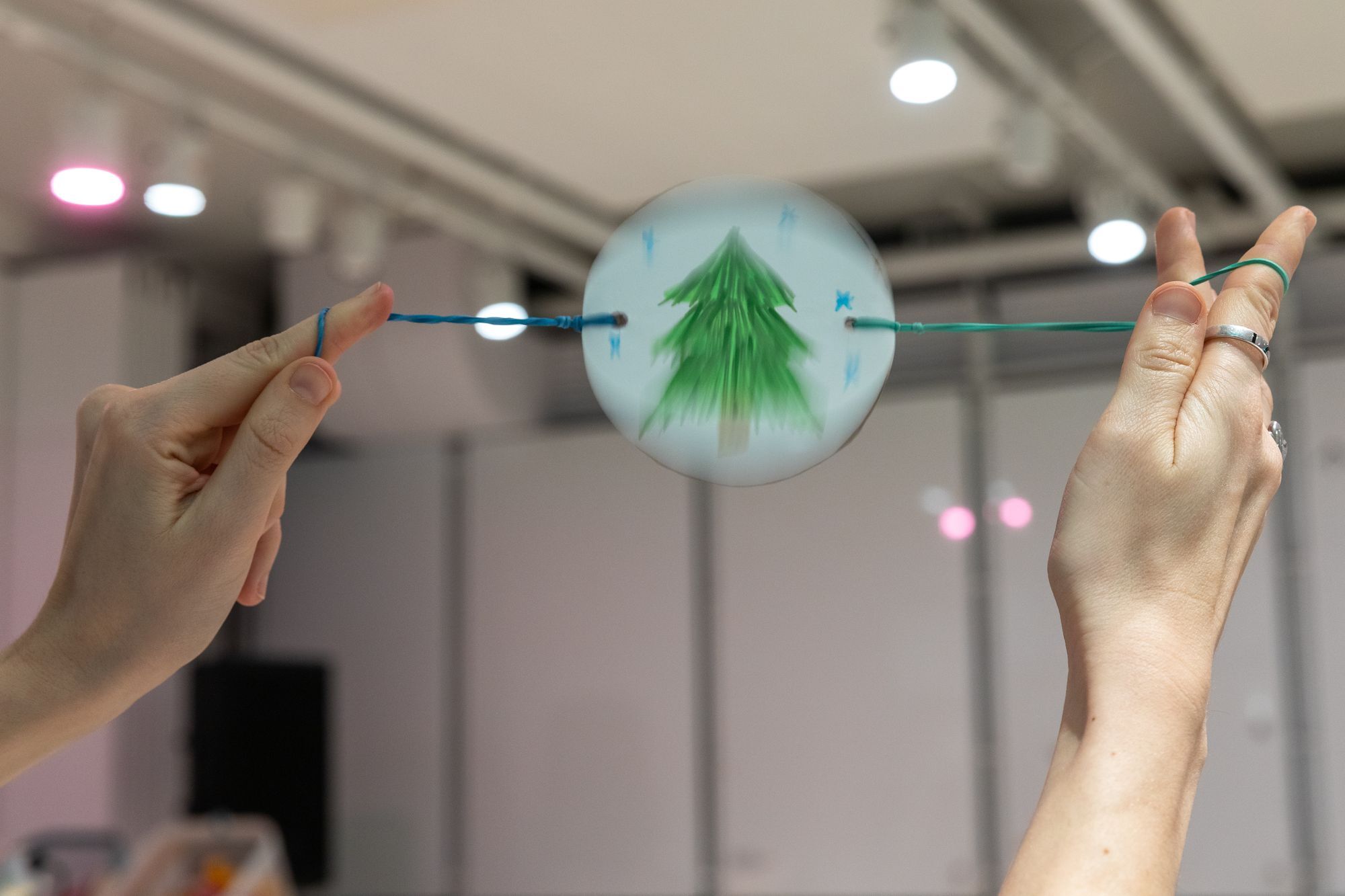 Один из самых простых и волшебных инструментов для создания мультфильмов называется тауматроп: два рисунка с разных сторон рамки при вращении сливаются в движущееся изображение. Вместе с художницей Сашей Цимбалюк мы создадим такое устройство и с его помощью оживим ваше воспоминание из уходящего года. Готовый тауматроп станет необычной елочной игрушкой.