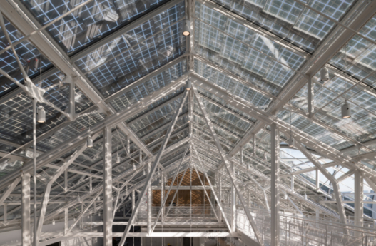 The power station’s sooty brick smokestacks have been replaced with tall blue metal chimneys. These perform a function opposite to that of their predecessors, drawing in clean air from an altitude of 72 metres and distributing it throughout the building.