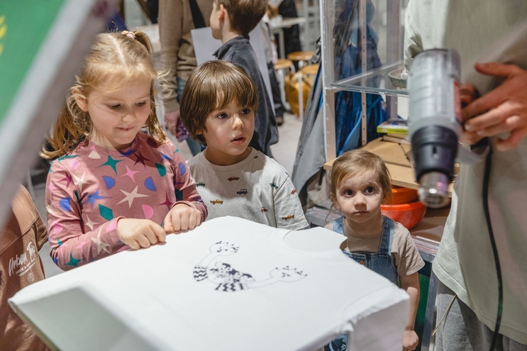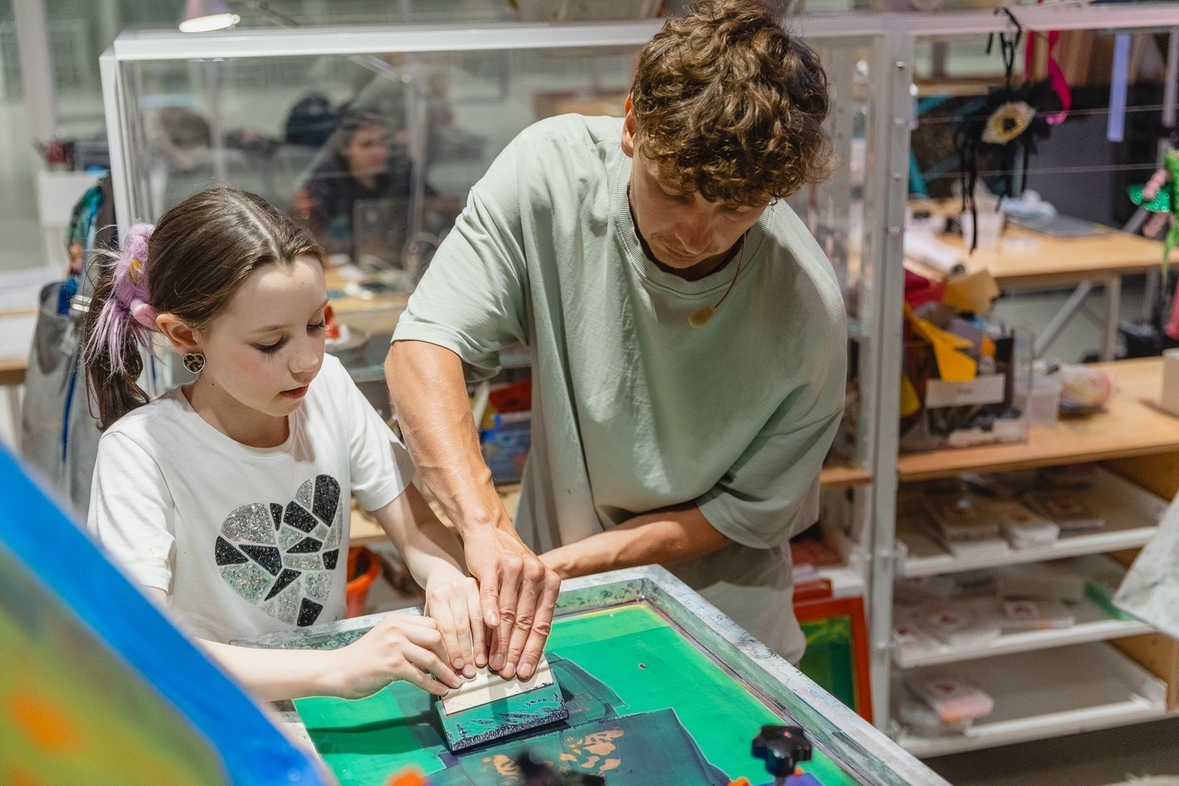Вместе мы запустили серию встреч, на которых дети и родители вместе с художницей Катей Дорохиной и дизайнером Михаилом Ильиным учатся создавать графическую композицию и наносить ее на текстиль. Сделать футболку с индивидуальным принтом можно и сейчас, расписание — на этой странице.