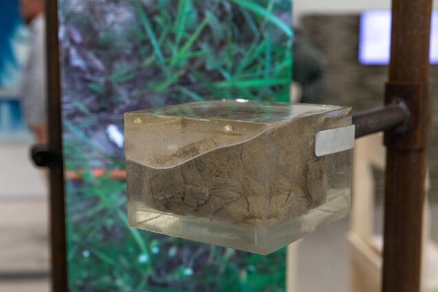 Кусок вечной мерзлоты, извлеченной из скважины в поле. Как часть криолитозоны, представляет собой среду, в которой вода может находиться одновременно в трех агрегатных состояниях — в виде льда, жидкости и пара. В то же время, будучи частью земной коры, мерзлота кажется твердью, на которой возможно организовать достаточно продолжительное существование.