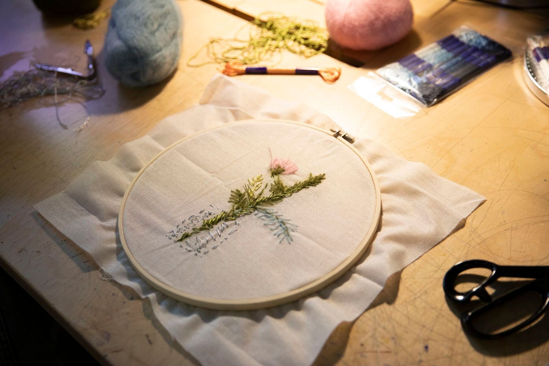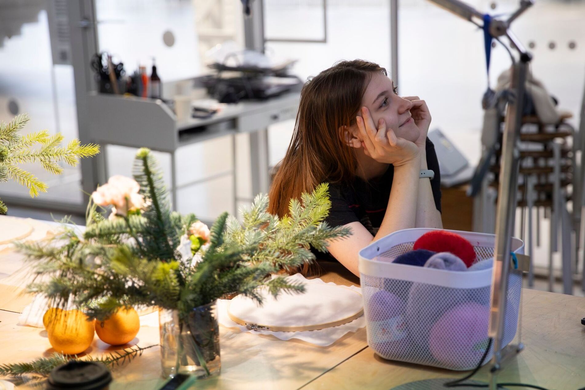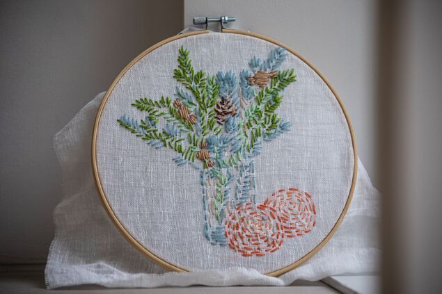 Мы соберемся за большим столом, где будет общий натюрморт из еловых ветвей и новогодних артефактов, и посвятим время вышивке, выбирая сюжеты из окружения. Готовую работу можно будет разместить на открытке, шопере, одежде или повесить на стену как панно.
