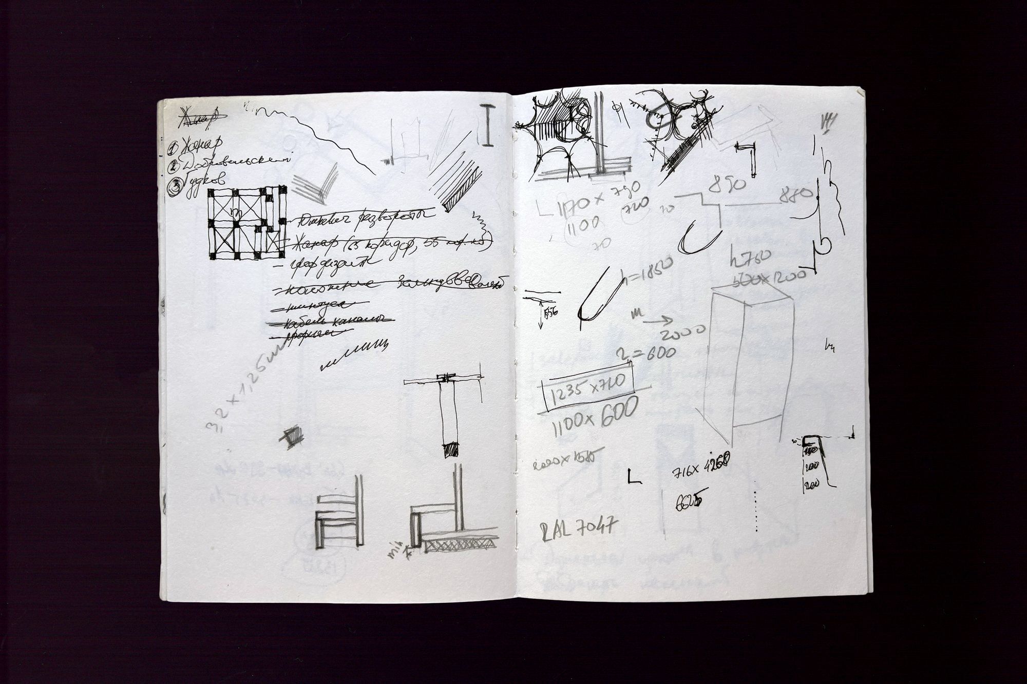 Блокнот, который Григорий Цебренко привез из Берлина. На развороте — процесс разработки чертежей ямальского проекта